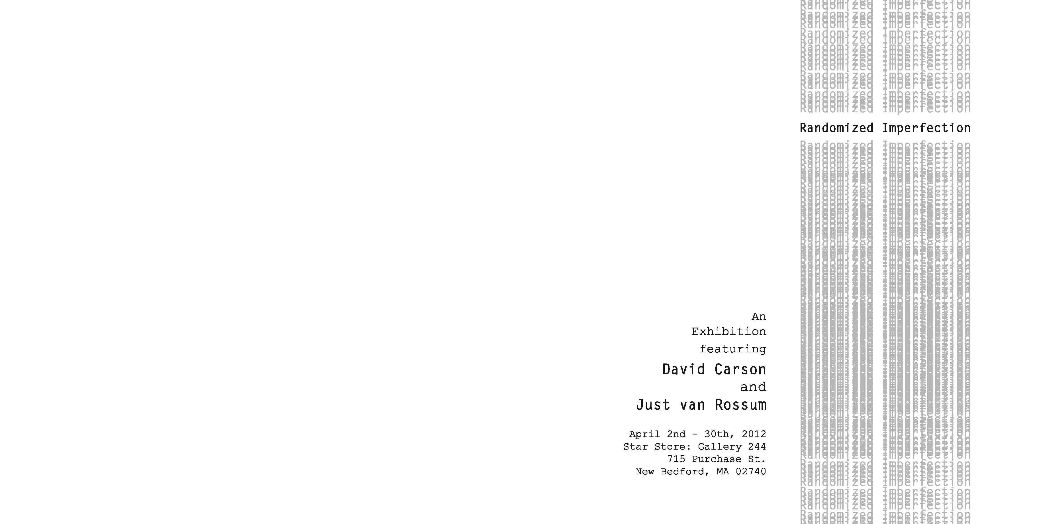 A faux exhibition book featuring two designers, David Carson and Just van Rossum. The design aesthetic of the book was meant to take advantage of the infinite possiblities of computer aided design, as well as highlight the importance of creating designs that are imperfect, seemingly randomized, and lively communication.Inkjet printFall 2012