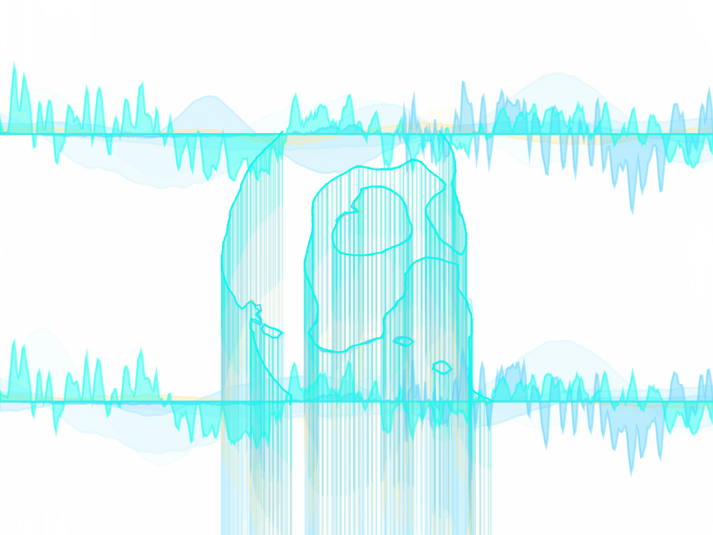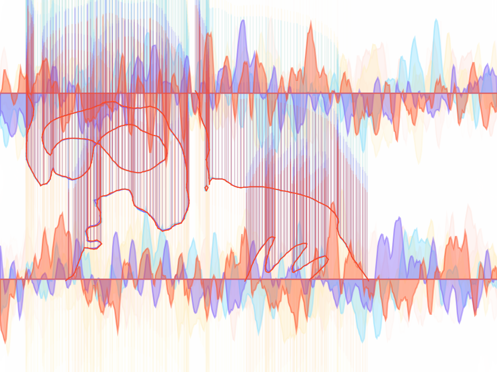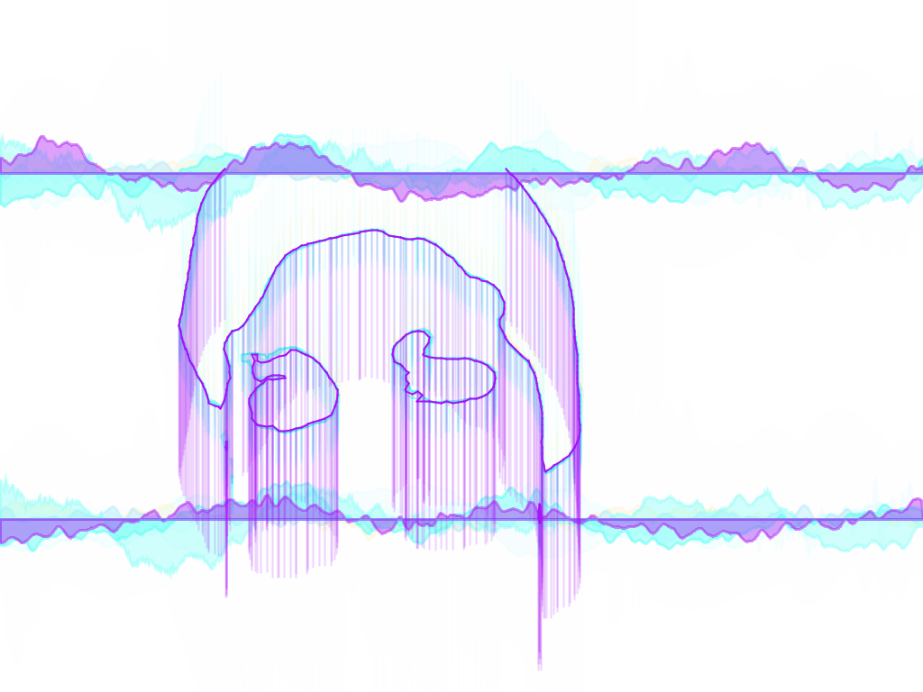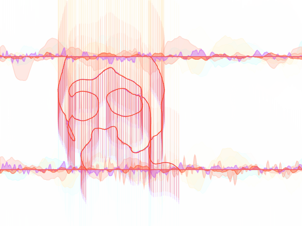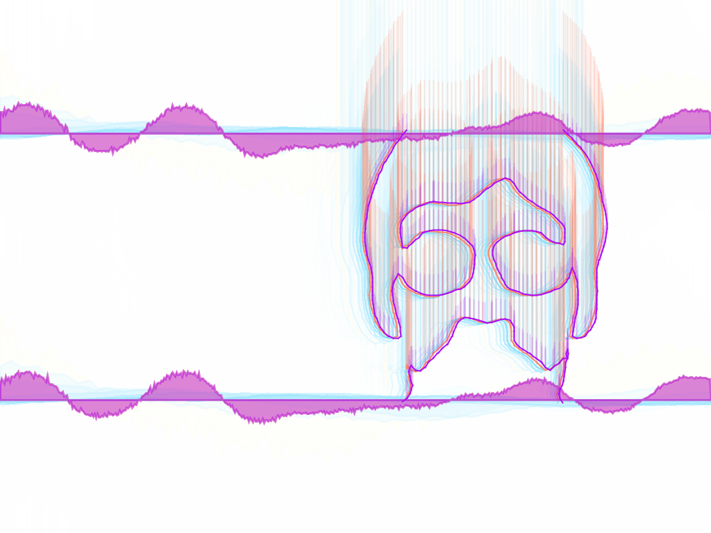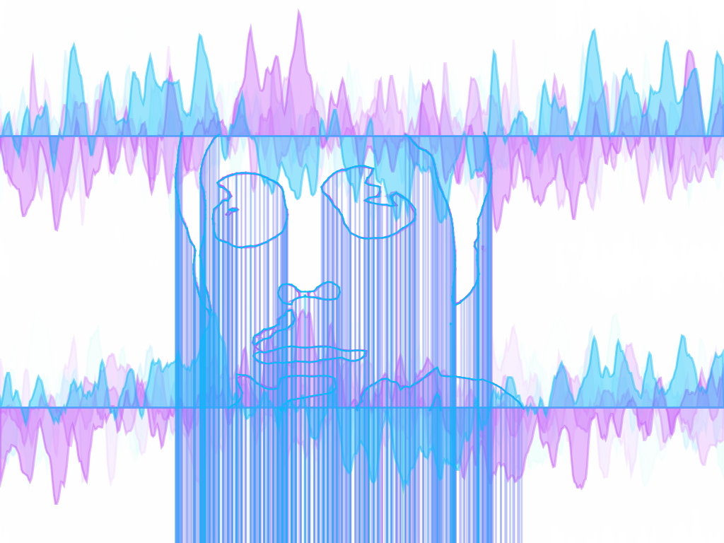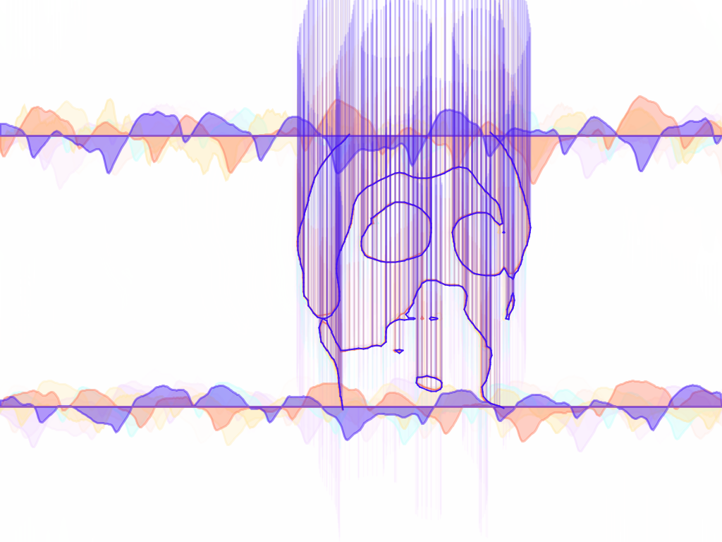 Visualizer in action. While song is playing, the program takes draws strokes around the users shape. The program also generates a waveform at the top and bottom of the screen. Additional lines are added to the user's figure in a sporatic manner, giving the piece a more random and dynamic feel.TIF OutputFall 2013.