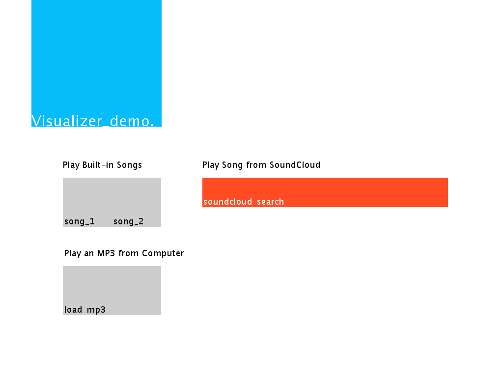 This is a java based visualizer, which utilizes the built in web cam of the computer in order to involve the viewer in the process of visual reinterpretation of the selected song. Users are allowed to play songs locally from their filesystem as well as search for a song using the Soundcloud Search Function.Libraries used:Soundcloud LibraryBlob Detection LibraryFall 2013.